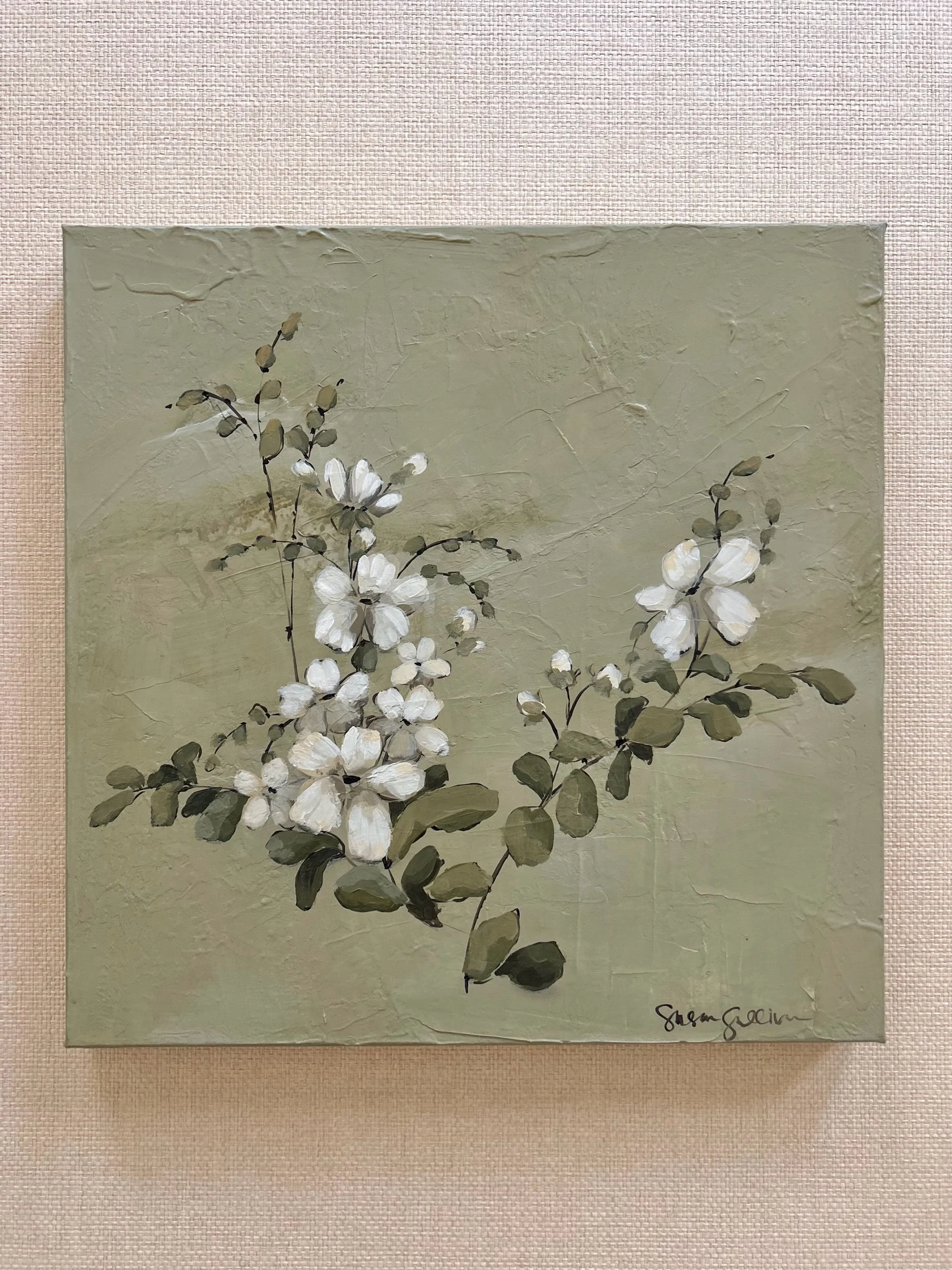 An original mixed media floral on 16x16” gallery-wrapped canvas with 1.5” depth. Painted edges. Unframed. Varnished, wired and ready to hang.